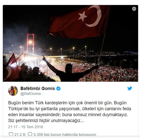 Gomis'in yanı sıra A Milli Futbol Takımı'nın formasını giyen ve Türkiye'yi yurt dışında temsil eden futbolcular Cenk Tosun, Yunus Mallı da 15 Temmuz Demokrasi ve Milli Birlik Günü için mesaj paylaştı.