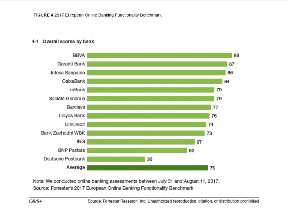 Garanti, Forrester’ın, Avrupa’nın önde gelen 13 büyük bankasını değerlendirdiği “2017 Avrupa Online Bankacılık İşlevsellik Raporu”nda, bünyesinde bulunduğu BBVA ile birlikte en yüksek skorları elde ederek zirvede yer aldı. Garanti Bankası, 100 üzerinden 87 puanla ikinci sırada yer alırken, BBVA ise 100 üzerinden 90 puanla birinci oldu. Benzer araştırmada, ABD ve Kanada kıtasındaki bankalar en fazla 86 puan aldı.