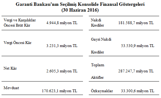 Garanti Bankası’nın 2016 Yılının İlk Yarısına Ait Konsolide Finansal Tablolarından