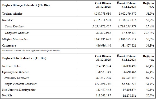 “2025, sadece finansal performans açısından değil; vizyonumuzu hayata geçirme yolunda stratejik ve kültürel derinlik kazandığımız bir yıl oldu. Müşteriyle birlikte büyümeye dayalı iş modelimiz, güçlü sermaye yapımız ve uzun vadeli değer yaratımına odaklı yaklaşımımızla sektördeki öncü konumumuzu pekiştirdik. Bu başarıda emeği geçen tüm çalışma arkadaşlarıma ve bize güvenen tüm paydaşlarımıza teşekkür ediyorum.”