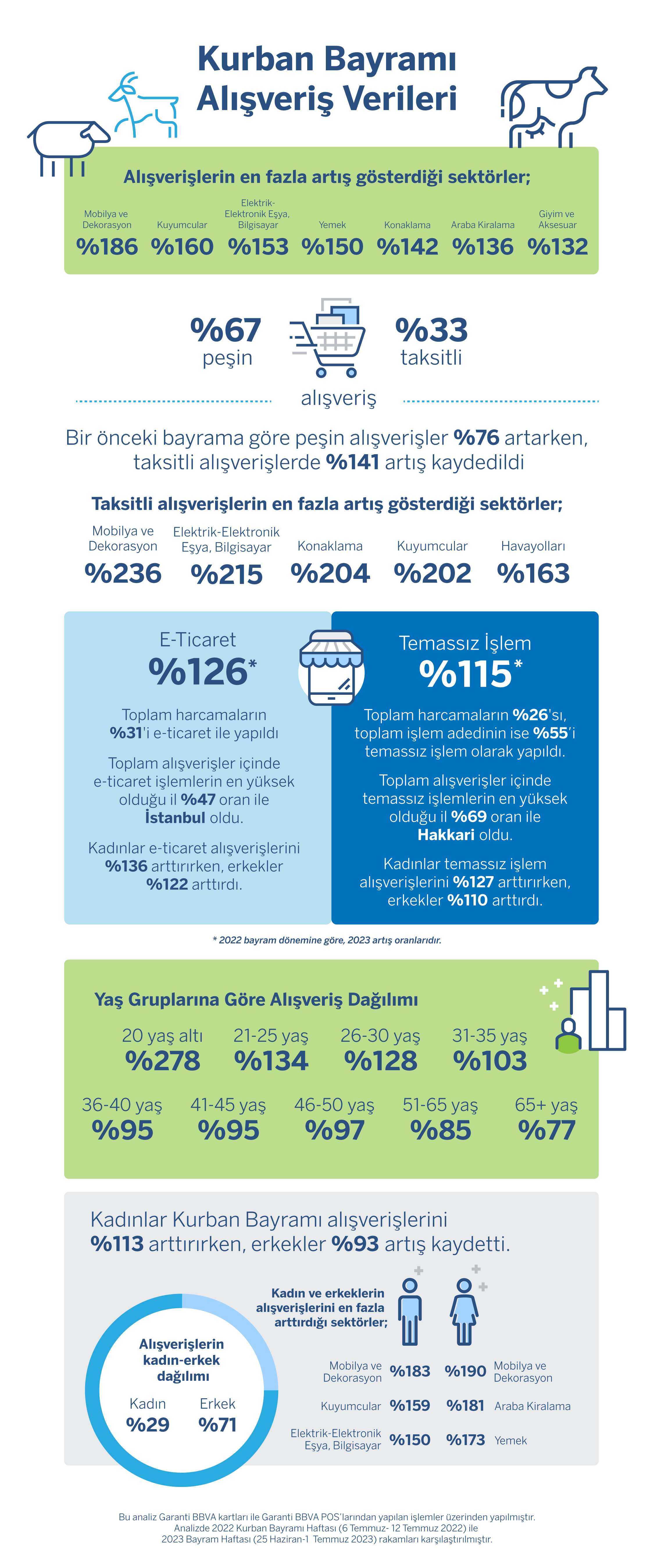 Garanti BBVA Ödeme Sistemleri (GÖSAŞ), Kurban Bayramı kapsamında, Garanti BBVA kartları ile Garanti BBVA POS’larından yapılan işlemler üzerinden gerçekleştirdiği araştırma verilerini açıkladı. 2022 ve 2023 yıllarının Bayram haftasını kapsayan araştırma; yıldan yıla alışverişlerin en fazla hangi sektörlerde arttığına, tüketici ve şehir bazında değişimlere dair veriler sunuyor.