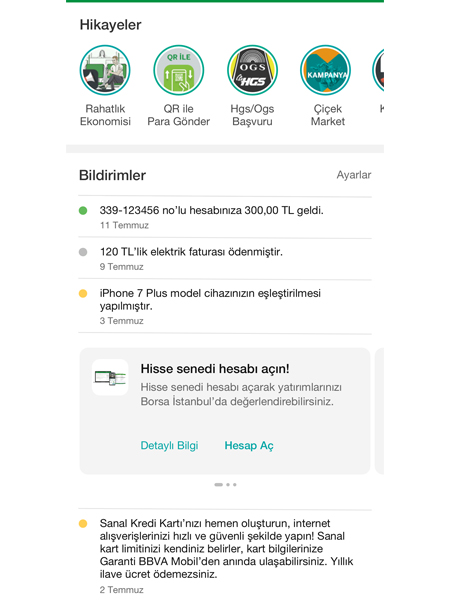 Kullanıcıların şubeye gitmeden neredeyse her işlemi dijitalden yapmalarını sağlayan Garanti BBVA, müşterilerini dijital kanallara daha çok yönlendirmek adına yeniliklerine devam ediyor. Kredi kartı ya da banka kartı olmayan müşteriler de, Garanti BBVA Mobil’in ana ekranında yer alan Parola Al/Parolamı Unuttum adımından görüntülü görüşerek şubeye gitmeden kolaylıkla parola alabiliyor. Garanti BBVA Mobil kullanıcıyla iletişim noktalarını da tek bir çatı altına topluyor. Kullanıcılar; hikâyeleri, bildirimleri, kendilerine özel kampanyaları ve ürün tekliflerini tek bir alandan görüntüleme kolaylığına kavuşuyor.