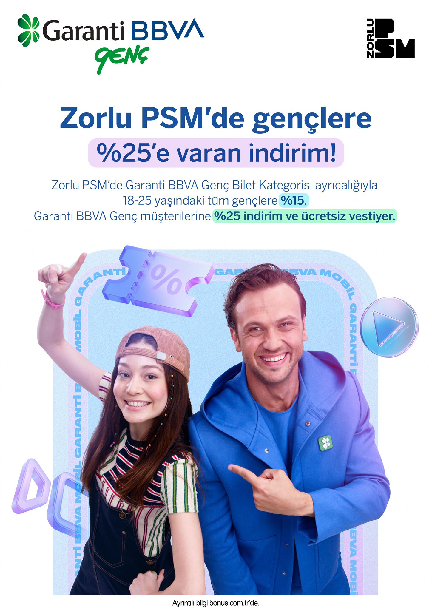 Yeni kategori Zorlu PSM’nin anlaşmalı olduğu bilet satış platformuve biletin üzerinde “Garanti BBVA Genç Bilet” adıyla yer alacak. Böylece gençler hem online hem de mekân içi iletişim kanallarında Garanti BBVA’nın desteğini görecekler.