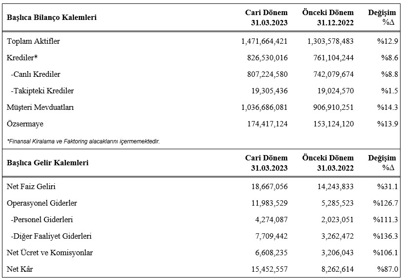 Garanti BBVA’nın seçilmiş konsolide finansal göstergeleri - 31 Mart 2023