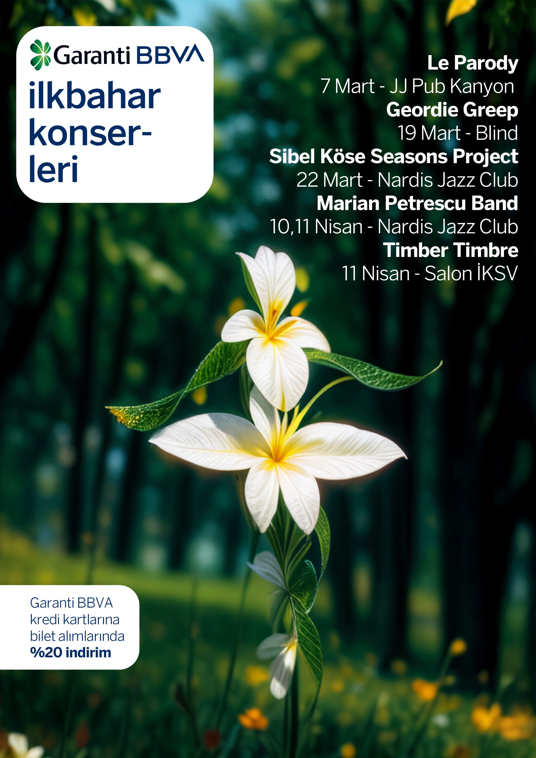 Garanti BBVA’nın geleneksel ‘Bahar Konserleri’ mart ayında müzikseverlerle buluşuyor. Bahar konserlerinin ilk döneminde, cazdan folk müziğe, deneysel rock’tan elektronik tınılara uzanan geniş bir repertuvarla, yerli ve uluslararası sanatçılar sahne alacak. Gerçekleşecek konserlerde Geordie Greep, Sibel Köse Season Project, Marian Petrescu Band ve Timber Timbre gibi isimler sahne alacak. Garanti BBVA Bahar Konserleri kapsamında düzenlenen etkinliklerde, Garanti BBVA kredi kartlarıyla bilet alımlarında yüzde 20 indirim fırsatı sunulacak.