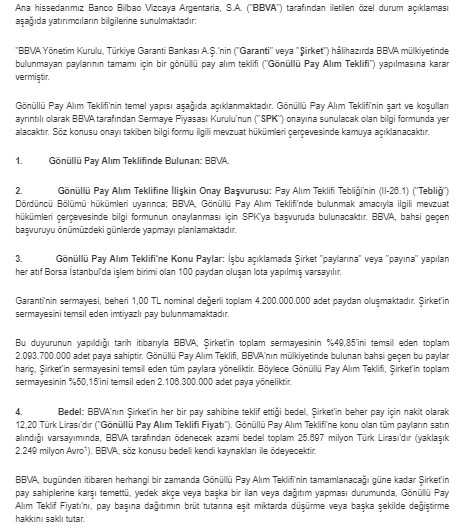 Gecikmiş bir karar. Ganarti Bankası'nda kaöç kere yönetim değişti GE önce GE aldı sonra BBVA geldi ama çağrı yapılmadı, şimdi az bir şey alarak çoğunluğu ele geçirecekler, açıklamada %50 yi geçmeleri durunda çağrı muafiyetinden bahsediyor. Düşüncem kimse satmasa dahi zaten %50 yi aştılar, kendi fonlarında vs vardır az bir şey, onu alıp %50 yi geçtik derler. Zaten %49.85'e sahipmişler.
