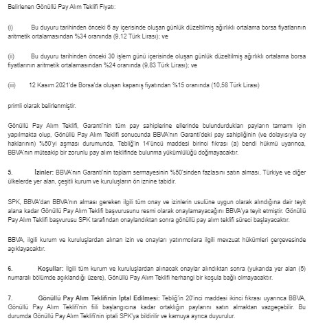 Garanti BBVA, Borsa İstanbul’da işlem gören yüzde 50,15 hissesi için gönüllü pay alım teklifi yapılmasına karar verdi. Garanti BBVA’dan Kamuyu Aydınlatma Platformu’na yapılan açıklamada önümüzdeki günlerde Sermaye Piyasası Kurulu’na başvuru yapılacağı belirtilirken bankanın her bir pay sahibine teklif ettiği bedel, nakit olarak 12.20 Türk Lirası olarak belirlendi. Bu fiyat cuma günkü kapanış fiyatı 10.58 liradan yüzde 15 primli belirlendi. Ve BBVA bu işlemler için 2.2 milyar Euro (yaklaşık 2.6 milyar dolar) ayırdığını açıkladı.