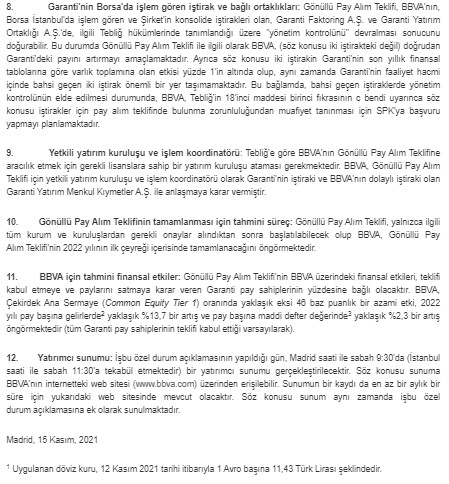Şirketten yapılan açıklamada da, tüm Garanti BBVA pay sahiplerinin teklifi kabul etme durumunda ve analistler tarafından Grup ve Türkiye iştiraki için tahmin edilen kâr dikkate alındığında, işlemin 2022’de pay başına geliri yüzde 13,7 ve pay başına maddi defter değerini Eylül 2021 itibariyle yüzde 2,3 artıracağı tahmin ediliyor. Aynı şekilde, Grubun Çekirdek Ana Sermaye oranı üzerindeki beklenen etkisi, sermaye oranlarında azınlık paylarının hesaplanması bakımından, Eylül 2021 itibariyle beklenen maksimum etki çok sınırlı (eksi -46 baz puanlık) olacak.