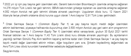 Bankadan KAP’a yapılan açıklamada Gönüllü Pay Alım Teklifi'ne konu olan tüm payların satın alındığı varsayımında, BBVA tarafından ödenecek azami bedel toplam 25 milyar 697 milyon Türk Lirası (yaklaşık 2 milyar 249 milyon Euro) olacak ve banka bu bedeli kendi kaynakları ile ödeyecek. BBVA, Gönüllü Pay Alım Teklifi'nin 2022 yılının ilk çeyreği içerisinde tamamlanacağını öngörüyor.