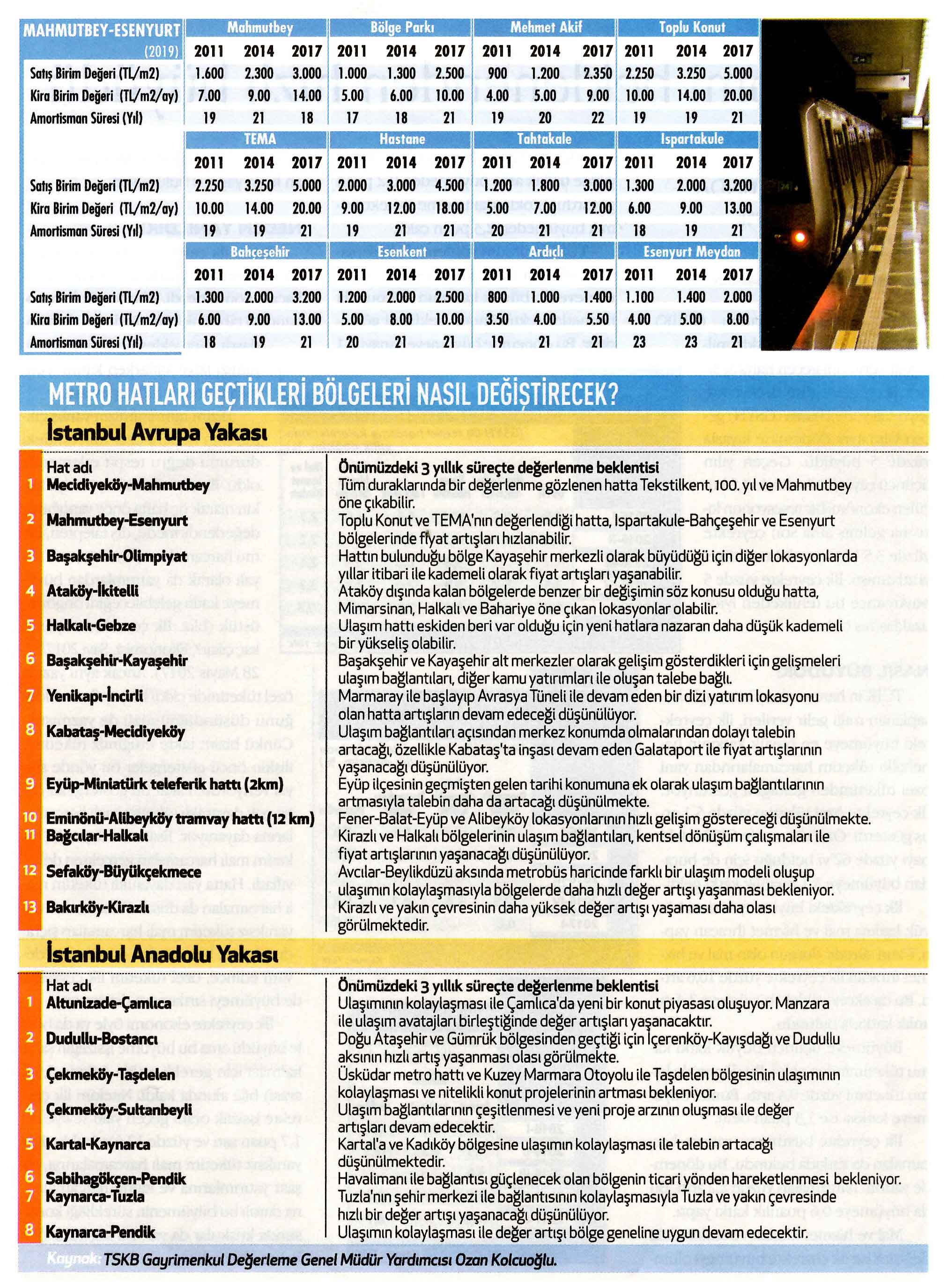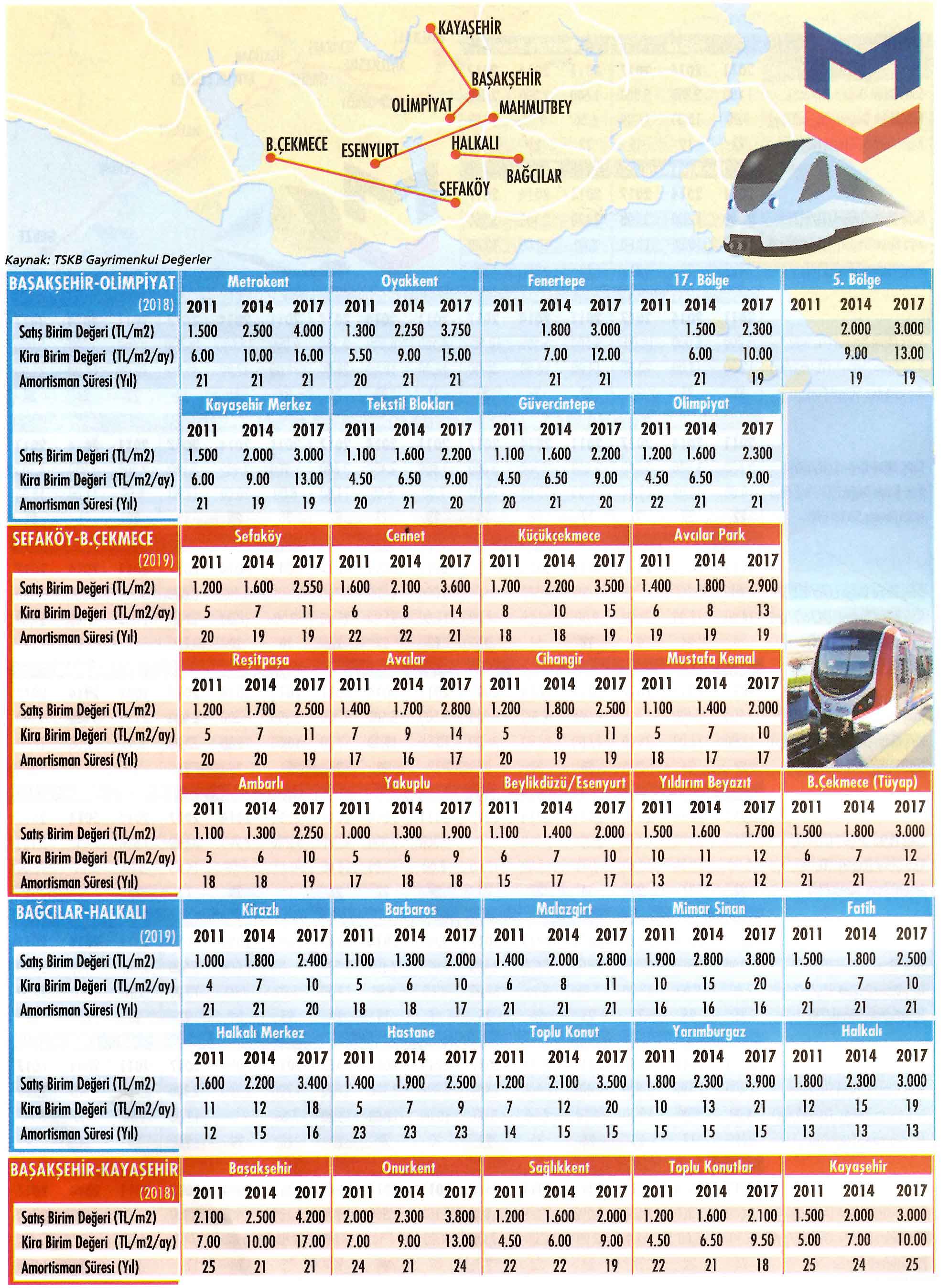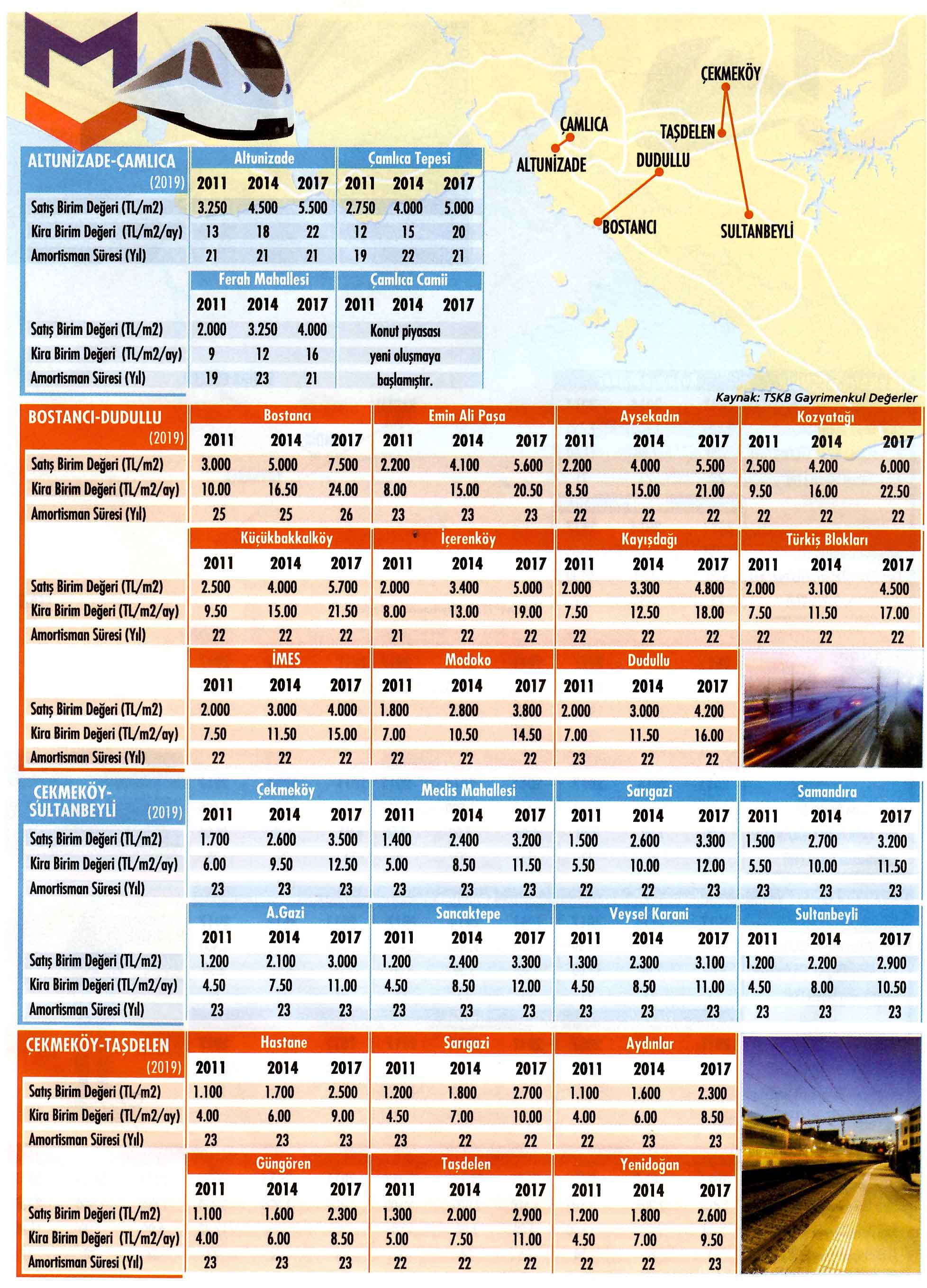 TSKB Gayrimenkul Değerleme, Ekonomist dergisine özel bir çalışma hazırlayıp, ulaşım projelerinin daha adının telaffuz edilmesinden bitimine kadar geçen zamanda geçtikleri bölgelerdeki gayrimenkulleri nasıl değerlendirdiklerini ortaya koydu. Mecidiyeköy-Mahmutbey, Sabihagökçen-Pendik, Halkalı-Gebze, Kabataş-Mecidiyeköy, Sefaköy-Büyükçekmece'nin de aralarında yer aldığı 11'i Avrupa Yakası'nda ve sekizi Anadolu Yakası'nda olmak üzere 19 metro hattı ile Eyüp-Miniatürk teleferik hattı (2km) ve Eminönü-Alibeyköy tramvay hattı (12 km) çalışmaya konu oldu. Bahsi geçen hatlardaki toplam 203 durağın tek tek incelenip fiyat değişimlerinin irdelendiği çalışmada, bu hatların gelecek dönemdeki değerlenme potansiyellerini de mercek altına aldık.