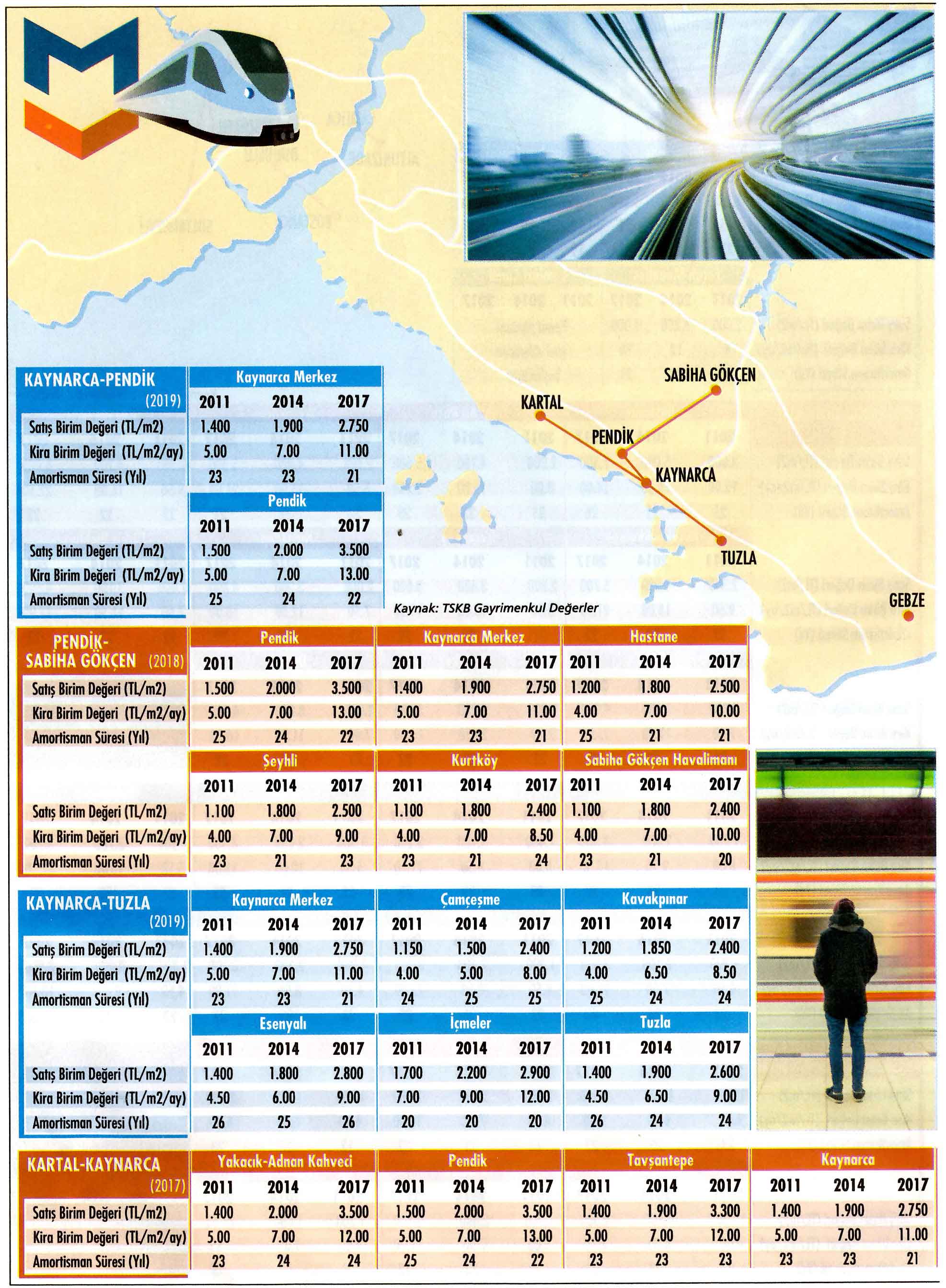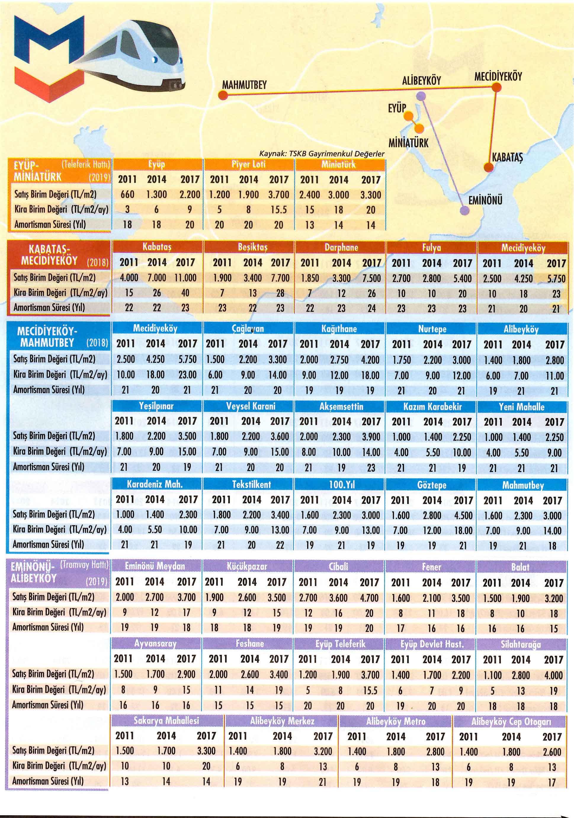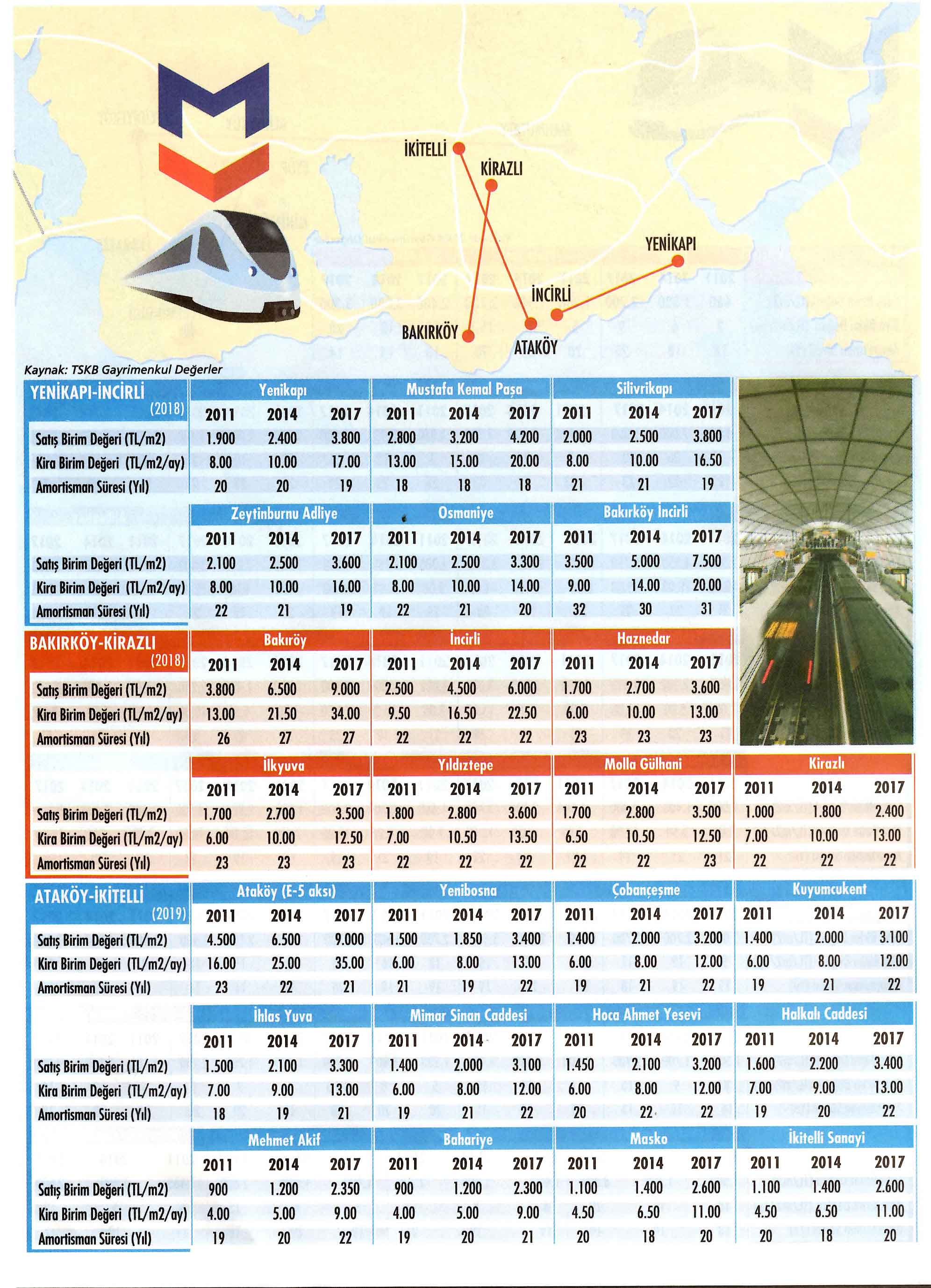 TSKB Gayrimenkul Değerleme, Ekonomist dergisine özel bir çalışma hazırlayıp, ulaşım projelerinin daha adının telaffuz edilmesinden bitimine kadar geçen zamanda geçtikleri bölgelerdeki gayrimenkulleri nasıl değerlendirdiklerini ortaya koydu. Mecidiyeköy-Mahmutbey, Sabihagökçen-Pendik, Halkalı-Gebze, Kabataş-Mecidiyeköy, Sefaköy-Büyükçekmece'nin de aralarında yer aldığı 11'i Avrupa Yakası'nda ve sekizi Anadolu Yakası'nda olmak üzere 19 metro hattı ile Eyüp-Miniatürk teleferik hattı (2km) ve Eminönü-Alibeyköy tramvay hattı (12 km) çalışmaya konu oldu. Bahsi geçen hatlardaki toplam 203 durağın tek tek incelenip fiyat değişimlerinin irdelendiği çalışmada, bu hatların gelecek dönemdeki değerlenme potansiyellerini de mercek altına aldık.