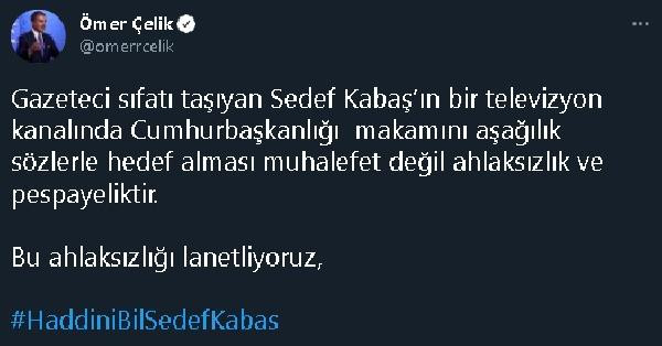 AK Parti Sözcüsü Ömer Çelik, Kabaş'ın ifadelerini ahlaksızlık olarak değerlendirerek, "Gazeteci sıfatı taşıyan Sedef Kabaş'ın bir televizyon kanalında Cumhurbaşkanlığı makamını aşağılık sözlerle hedef alması muhalefet değil ahlaksızlık ve pespayeliktir. Bu ahlaksızlığı lanetliyoruz. Milletin oylarıyla seçilmiş Cumhurbaşkanımıza, devletimizin başına bu çirkin üslupla hitap millete ve milli iradeye hakarettir. Bu ahlaksızlığı mahkum ediyoruz. Bu aşağılık davranışla hukuki ve siyasi olarak en güçlü şekilde mücadele edeceğiz" ifadelerini kullandı.