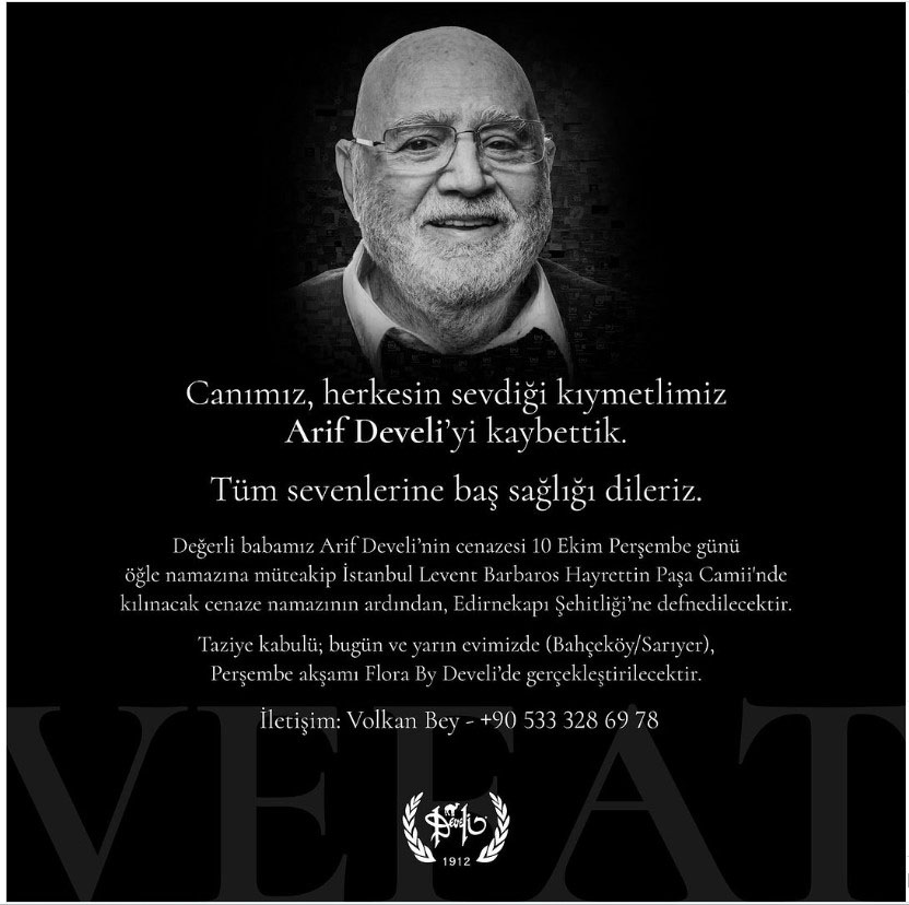 Gaziantep’in meşhur tatlarını İstanbul’a taşıyarak hem yerel hem ulusal ölçekte geniş bir hayran kitlesi oluşturan Arif Develi’nin cenazesi, perşembe günü Beşiktaş Barbaros Camii’nde kılınacak öğle namazının ardından Edirnekapı Şehitliği’ne defnedilecek.