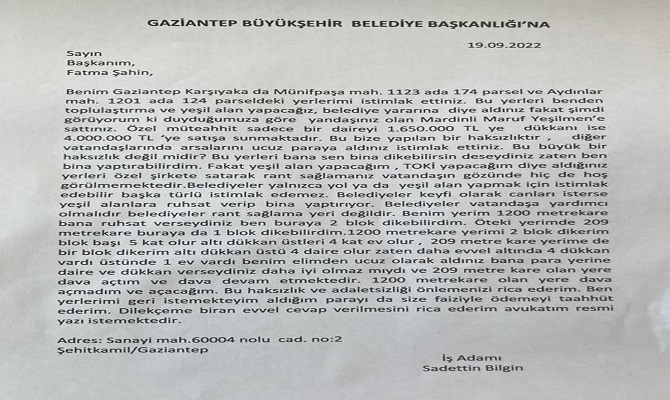 İddiaya göre Gaziantep Büyükşehir Belediyesi'nin Yeşil alan yapacağız diyerek istimlak edilen bazı arsalara mütahitlerin bina yapması üzerine vatandaşlar 'arsamı verin' diyerek mektup yazdılar. Sözcü'den Veli Toprak'ın konuyla ilgili haberi şöyle:
