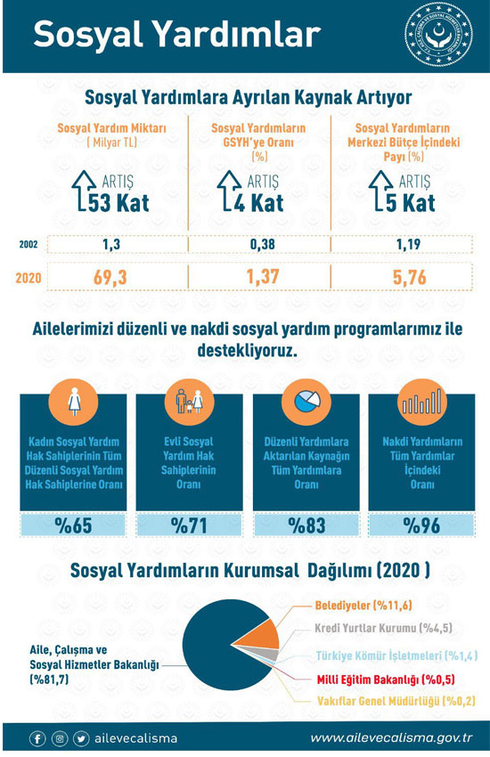 Selçuk'un paylaştığı infografikte yer alan verilere göre; sosyal yardım miktarı 2002'de 1,3 milyar TL iken 2020'de yüzde 53 artışla 69,3 milyar TL oldu.