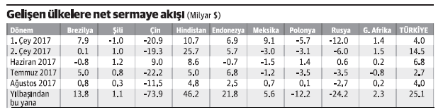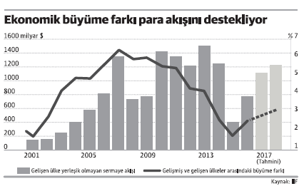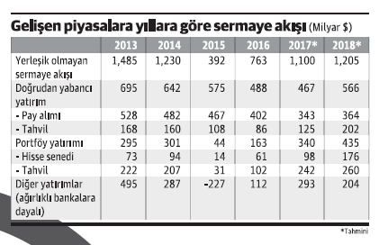 Getiri avına çıkan yabancı yatırımcının gelişmekte olan ülke piyasalarıyla aşkı büyüyor. ABD'de parasal sıkılaştırmaya rağmen gelişmekte olan ülkelerdeki ekonomik büyüme ve hala cazibesini koruyan carry-trade faaliyetleri bu piyasalara sermaye akışının hızlanmasını sağladı. Uluslararası Finans Enstitüsü (IIF) gelişmekte olan piyasaların bu yıl yerleşik olmayan yatırımcılardan 1.1 trilyon dolar sermaye çekeceğini öngördüklerini bildirdi. Türkiye, yerleşik olmayan sarmeye girişinin hızlı arttığı ülkeler arasında yer alıyor. Dünyada yabancı yatırımlarının 2018 yılında ise 1.2 trilyon dolara çıkması bekleniyor.