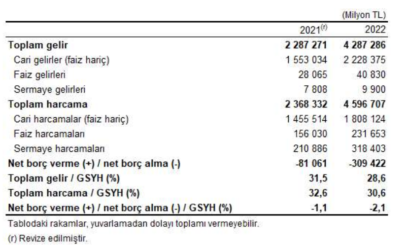 Genel devlet toplam gelirleri 4 trilyon 287 milyar 286 milyon TL'ye yükselirken, gelirlerin GSYH içindeki payı %28,6'ya düştü. Genel devlet toplam harcamaları 2022 yılında 4 trilyon 596 milyar 707 milyon TL'ye yükselirken, harcamaların GSYH içindeki payı %30,6'ya düştü.