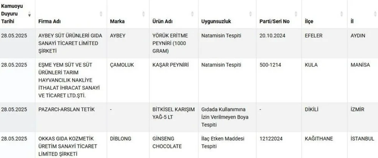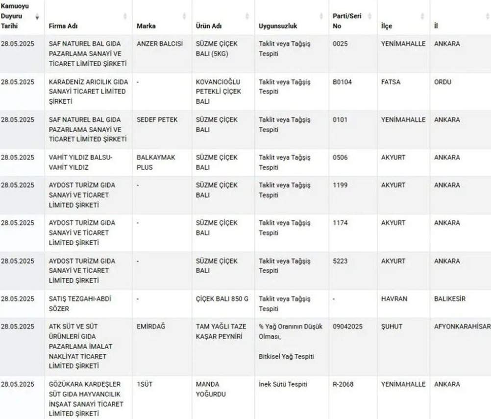 Tarım ve Orman Bakanlığı, sağlıksız ve sahte gıdaların ifşasına devam ediyor. Denetimler sonucu taklit ve tağşiş yapıldığı belirlenen yeni ürünler kamuoyuyla paylaşıldı.