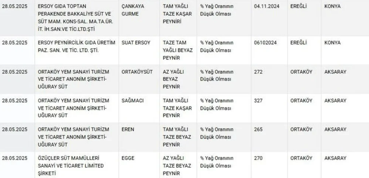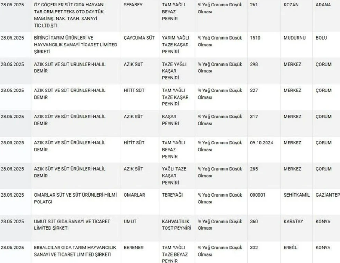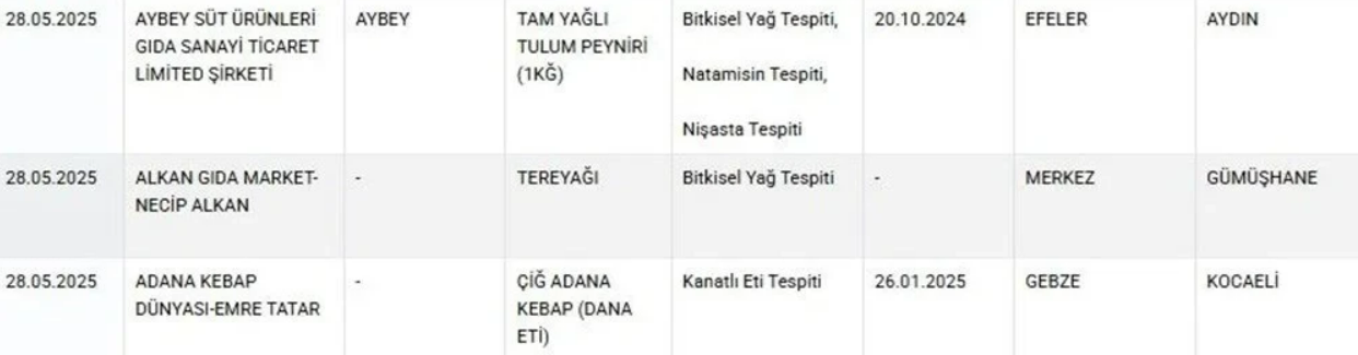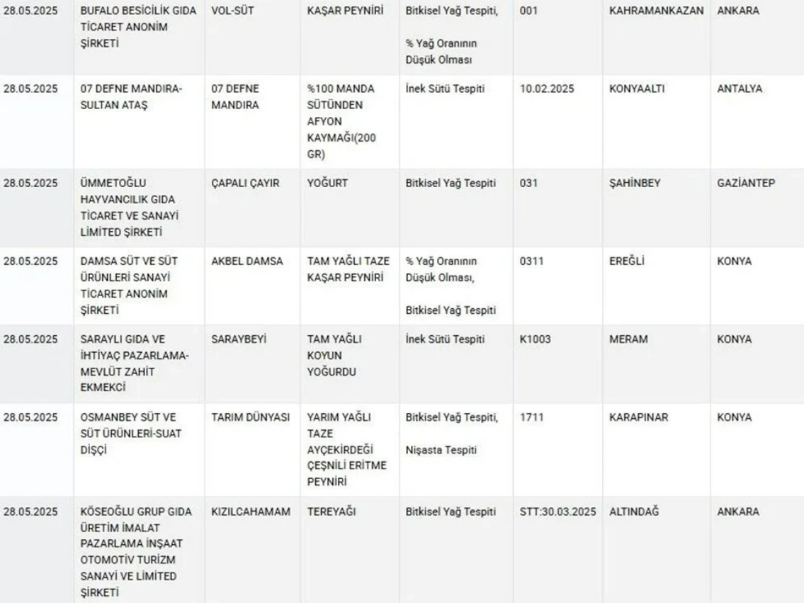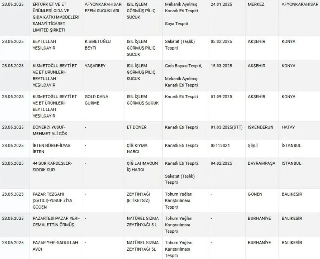 Dünya'nın haberine göre, güncellenen listede boya katılmış yağlar, kanatlı eti karıştırılmış lahmacunlar, içeriği değiştirilmiş yoğurt ve börekler dikkat çekti.