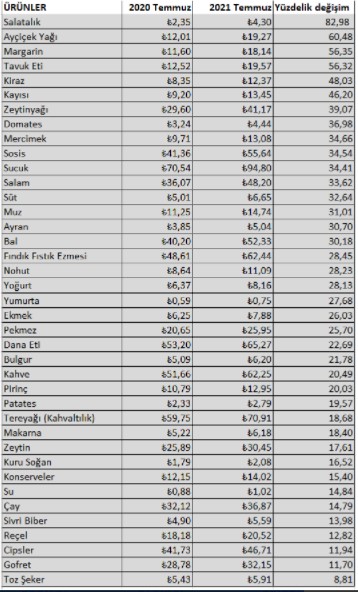 Seçili ürünlerin 2020 ve 2021 Temmuz fiyatları ile yüzdelik artışları şöyle: