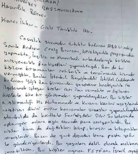 09.05.2018 tarihinde İzmir Cumhuriyet Başsavcılığı’na gizli tanık olmak için başvuran şahıs, Brunson’ın İngiliz ve Amerikalı arkadaşlarıyla birlikte misyonerlik faaliyeti yaptığını belirterek “Ben de bu kişilere bir zamanlar rehberlik ve tercümanlık hizmeti vermiştim” diyor.