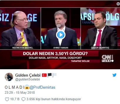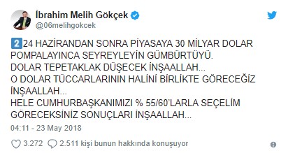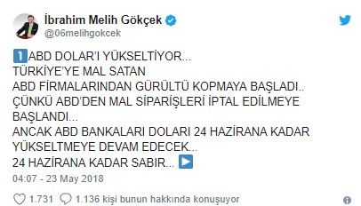 Gökçek, sosyal medya hesabı Twitter'da 'ABD'nin doları yükselttiğini' söylerken vatandaşların 24 Haziran'daki seçime kadar sabretmesini istedi. Gökçek ayrıca "24 Haziran'dan sonra piyasaya 30 milyar dolar pompalayınca seyreyleyin gümbürtüyü. Dolar tepetaklak düşecek inşallah. O dolar tüccarlarının halini birlikte göreceğiz. Hele cumhurbaşkanımızı yüzde 55-60'la seçelim göreceksiniz sonuçları inşallah" diye yazdı.