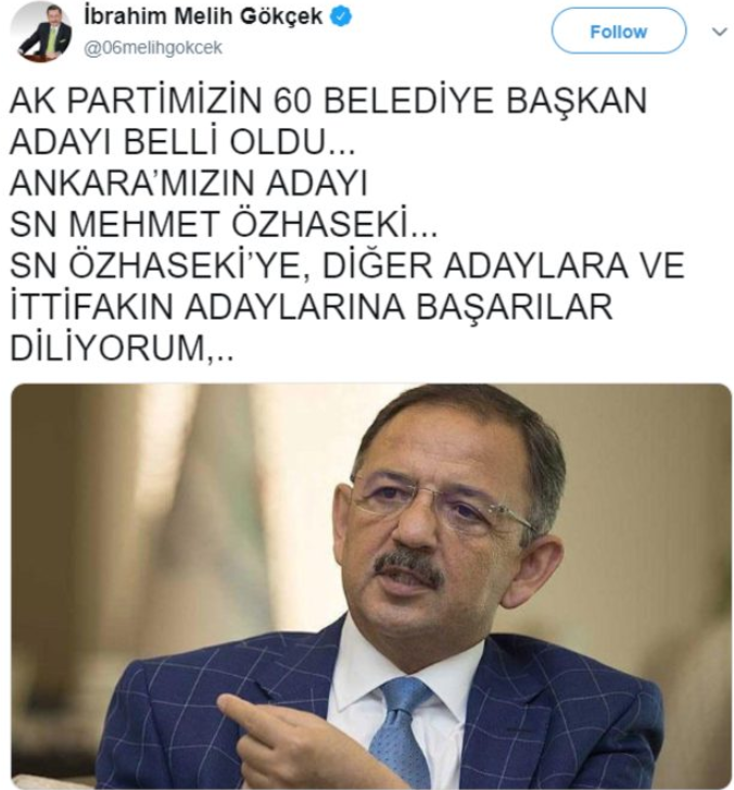 Gökçek'in sosyal medya hesabından, Mehmet Özhaseki'ye dair attığı tweetleri sildiği görüldü. Gökçek'in bu hareketiyle, Özhaseki'den desteğini geri çektiği yorumları yapıldı.(Sputnik)