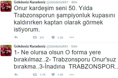 Rubin Kazan forması giyen tecrübeli oyuncu twitter üzerinden yaptığı ikinci paylaşımında ise "Onur kardeşim seni 50. Yılda Trabzonspor'un şampiyonluk kupasını kaldırırken kaptan olarak görmek istiyorum" ifadelerini kullandı.