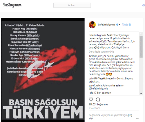 Bafetimbi Gomis, paylaşımında, "Belki bizler için hayat devam ediyor ama 11 şehidin ailesinin evine ateş düştü. Tanrı'dan şehitlerimiz için rahmet, aileleri ve tüm Türkiye'ye başsağlığı diliyorum. Çok üzgünüm." ifadelerini kullandı.
