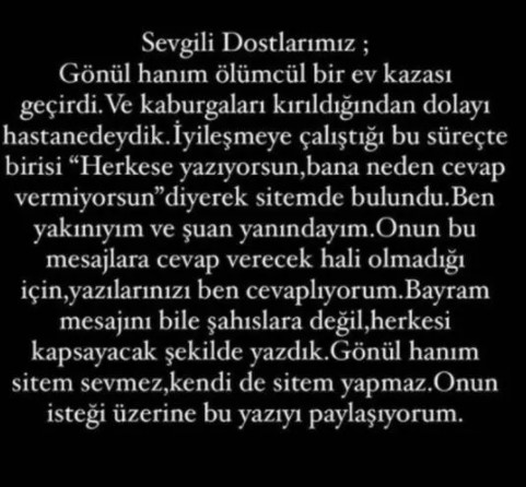 "Sevgili dostlarımız; Gönül hanım ölümcül bir ev kazası geçirdi. Ve kaburgaları kırıldığından dolayı hastanedeydik. İyileşmeye çalıştığı bu süreçte birisi "Herkese yazıyorsun, bana neden cevap vermiyorsun" diyerek sitemde bulundu.