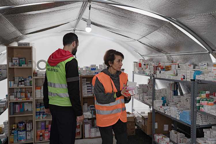 Hastaların tedavi alacağı çadırların kurulum aşamasında da çalışan fedakar doktorlar, muayene ettikleri hastaların ilaçlarını bağışlarla kurulan eczaneden ücretsiz tedarik ediyor.