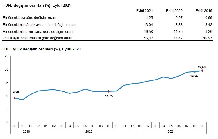 TÜİK'in açıkladığı verilere göre, H-ÜFE 2021 yılı eylül ayında bir önceki aya göre yüzde 2,32 azalış, bir önceki yılın Aralık ayına göre yüzde 28,88, bir önceki yılın aynı ayına göre yüzde 31,30 artış gösterdi.