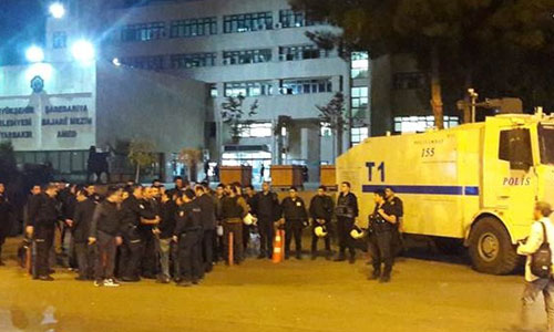 Bu sırada, aralarında HDP Diyarbakır milletvekilleri Feleknas Uca ve Çağlar Demirel ile yaklaşık 50 kişilik partili bir grup da belediye önüne gelerek, içeriye girmek istedi. Ancak polis, gruba izin vermedi.
