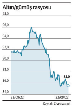 Bu arada gümüşün altından daha iyi performans gösterdiği dikkat çekiyor. Bon f ay içinde ons altın yüzde 5’ten fazla düşerken, gümüşün onsu yüzde 1.3 civarında yükseldi. Bu dönem içinde, 1 ons altının aldığı gümüş miktarına işaret eden altın/ gümüş rasyosu da geriledi. 22 Ağustos-22 Eylül arasında en yüksek 96 seviyesine kadar çıkan oran, şu sıralar 85 civarında. Bu da gümüşün altın ile makası kapattığına işaret ediyor.