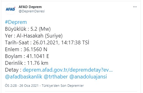 Saat 14.17'de Suriye Al-Hasakah merkez üslü depremin şiddeti 5.2 olarak açıklandı.