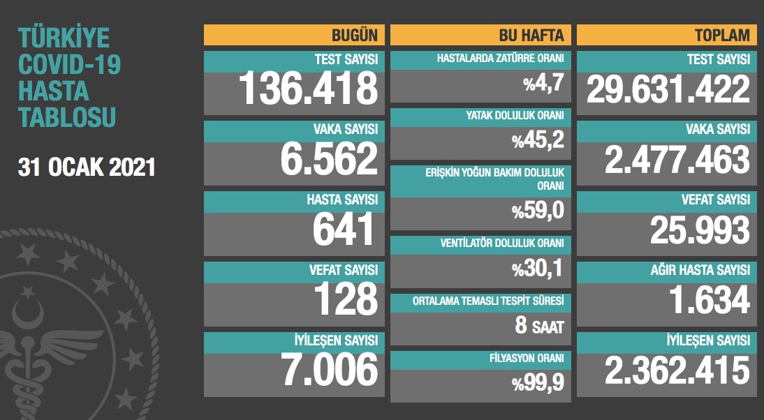Verilere göre, Türkiye'de korona virüs nedeniyle 128 kişi daha hayatını kaybetti, 6 bin 562 yeni vaka tespit edildi. Bugün yeni hasta sayısı ise 641 oldu.