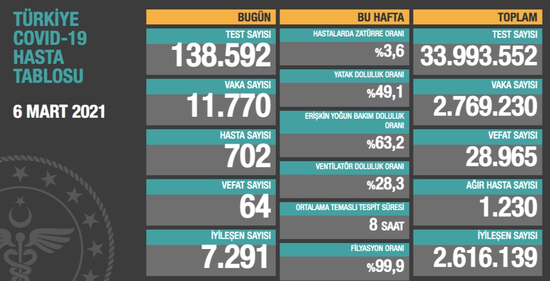 Türkiye'de son 24 saatte 138 bin 592 Kovid-19 testi yapıldı, 11 bin 770 kişinin testi pozitif çıktı, 65 kişi hayatını kaybetti.