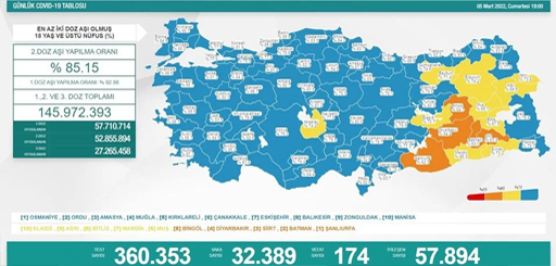 Bakan Koca 5 Mart 2022 Cumartesi günü 32 bin 389 vakaya rastlandığını açıkladı. Koca ayrıca 174 vatandaşımızın hayatını kaybettiğini açıkladı.