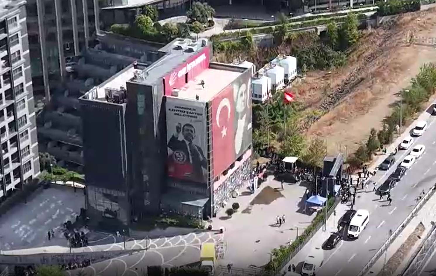 Binanın çevresinde geniş güvenlik önlemleri alınırken, çevik kuvvet ekiplerinin nöbeti devam ediyor. Bina çevresindeki bekleyiş ve polis konuşlanması havadan da görüntülendi.