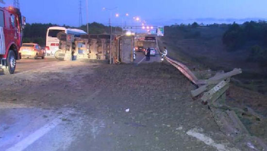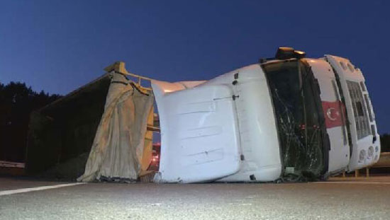 Eyüpsultan’da Hasdal Kemerburgaz yolunda seyir halindeki hafriyat yüklü kamyonun sürücüsü henüz bilinmeyen nedenle direksiyon hakimiyetini kaybetti. Kontrolden çıkan kamyon devrildi. Kazada 2 kişi yaralandı. Kaza nedeniyle trafik İstanbul Havalimanı istikametinde tamamen durdu.