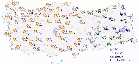 Ülkemizin doğu kesimlerinin çok bulutlu, Doğu Karadeniz kıyı illeri, Doğu Anadolu'nun doğusu, ve Güneydoğu Anadolu ile Hatay çevrelerinin yağışlı, diğer yerlerin parçalı ve az bulutlu geçeceği tahmin ediliyor. Güneydoğu Anadolu, Doğu Karadeniz kıyı kesimi ile Hatay çevrelerinde yağmur ve sağanak, yağış alan diğer yerlerde karla karışık yağmur ve kar şeklinde görülecek yağışların, Şırnak ve Siirt'in doğusu, Van'ın güneyi, Hakkari ve Bitlis çevrelerinde yer yer yoğun kar şeklinde olması bekleniyor. Gece ve sabah saatlerinde kuzey, iç ve doğu kesimlerde pus ve yer yer sis ile birlikte iç ve doğu kesimlerde buzlanma ve don olayı bekleniyor.