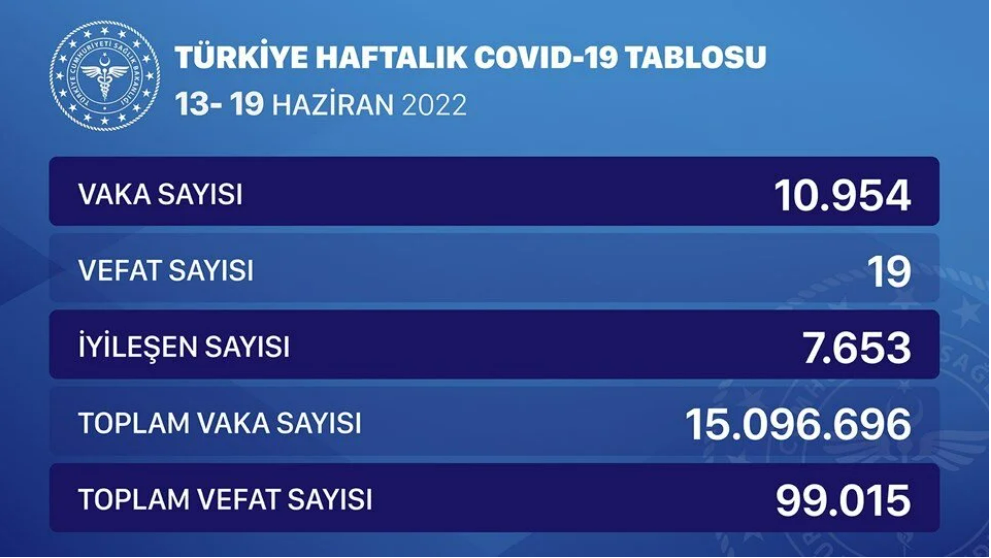 Buna göre, 13-19 Haziran'da 10 bin 954 kişinin testi pozitif çıktı, 19 kişi yaşamını yitirdi, iyileşenlerin sayısı ise 7 bin 653 oldu.