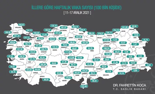 Sağlık Bakanı Fahrettin Koca, 11-17 Aralık arasında illere göre her 100 bin kişide görülen koronavirüs vaka sayılarını açıkladı.