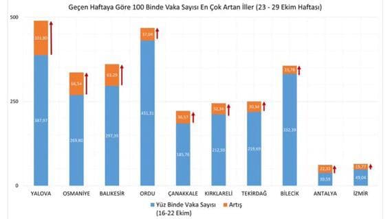 Vaka sayısı en çok artan illeri de açıklayan Bakan Koca, “23-29 Ekim arasında vaka yoğunluğu bir önceki haftaya göre en çok artan 10 ilimiz: Yalova, Osmaniye, Balıkesir, Ordu, Çanakkale, Kırklareli, Tekirdağ, Bilecik, Antalya, İzmir.” dedi.