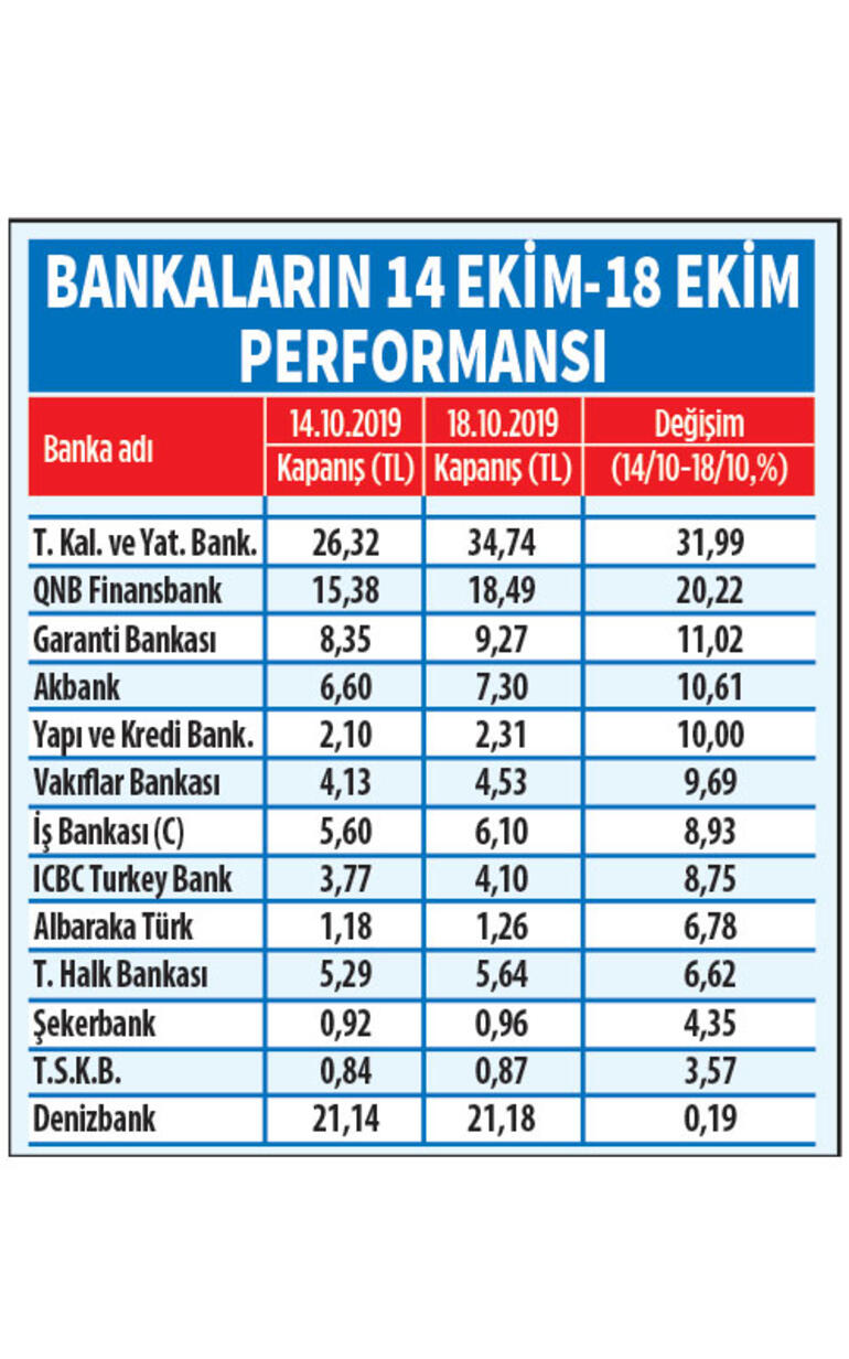 Banka hisselerine bakıldığında yılbaşından bu yana en düşük performansı gösterenin yüzde 19,66 değer kaybı ile Halkbankası olduğu görülmekte. Halkbank 14 Ekimden bu yana yüzde 6 değer kazandı. ICBC Turkey Bank ise yılbaşından bu yana yüzde 16,84 kayıpla düşük performans gösteren bankalar içerisinde ikinci sırada yer aldı. ICBC Turkey Bank 14 Ekim’den bu yana yüzde 8,75 değer kazandı. Bunun yanı sıra yılbaşından bu yana yüzde 100’ün üzerinde değer kazanan banka hisseleri de var. QNB Finansbank yüzde 105, T. Kalkınma ve Yatırım Bankası ise yüzde 104 değer kazandı. QNB Finansbank 14 Ekimden bu yana yüzde 20,22 değer kazanırken, T. Kalkınma ve Yatırım Bankası yüzde 31,99 yükseldi.