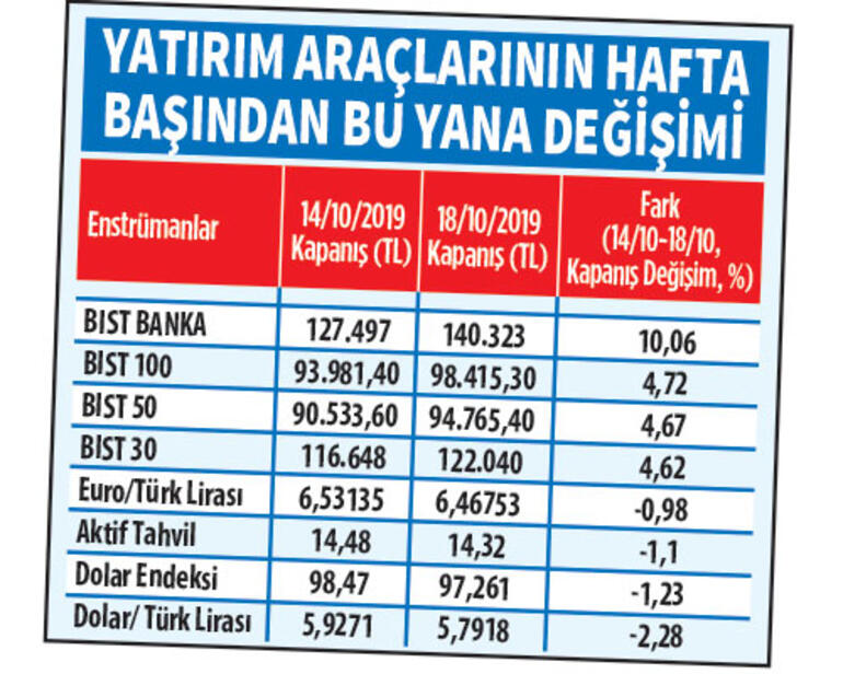 Piyasalar yüksek gerilim sonrası rahat bir nefes aldı. Borsa yükselirken dolar ve faiz geriledi. Hafta içerisinde 93.031 seviyesine kadar gerileyen BIST 100 Endeksi haftayı 98.415 seviyesinden tamamladı. Hafta içerisinde 5,9392 seviyesine kadar yükselen dolar/TL kuru ise 5,80 seviyesinin altına kaydı ve 5,75 seviyesi görüldü. Dolar kuru haftayı 5,7896 seviyesinden tamamladı. Barış Pınarı Harekâtında frene basılması beraberinde rahatlamayı getirdi.