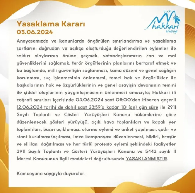 "Hakkari ili coğrafi sınırları içinde 3 Haziran saat 08.00'den geçerli 12 Haziran tarihi de dahil saat 23.59'a kadar 10 gün süreyle 2911 Sayılı Toplantı ve Gösteri Yürüyüşleri Kanunu hükümlerine göre düzenlenecek gösteri yürüyüşü, açık hava toplantıları ve kapalı yer toplantıları, basın açıklaması, oturma eylemi ve anket yapılması, çadır ve stant kurulması, imza kampanyası düzenlenmesi, bildiri, broşür ve el ilanı dağıtılması ve her türlü protesto eylemi şeklindeki faaliyetler 2911 Sayılı Toplantı ve Gösteri Yürüyüşleri Kanunu ve 5442 sayılı İl İdaresi Kanunu'nun ilgili maddeleri doğrultusunda yasaklanmıştır."