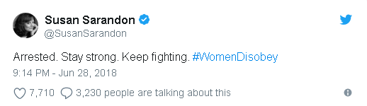 Sarandon gözaltına alındığını Twitter üzerinden "Gözaltına alındım. Güçlü kalın. Mücadeleye devam. #KadınlarBaşkaldırıyor” ifadesiyle duyurmuştu.