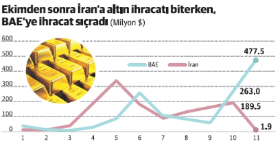 Altın ve mücevher ihracatçıları İran ile iş yapmanın zorluklarına alışkın. Mücevher İhracatçıları Birliği Başkanı Ayhan Güner, komisyon kararından sonra ihracatçı firmaların hızlı bir şekilde İran ile altın ticaretini Dubai üzerinden yapmaya başladığını söyledi. TÜİK veriler de Güner’i doğruluyor. İran altın ihracatının 190 milyon dolardan 1.9 milyon dolara gerilediği dönemde, Birleşik Arap Emirlikleri’ne yapılan altın ihracatı 263 milyon dolardan 478 milyon dolara fırladı. Gümrük ve Dış Ticaret Bakanlığı verilerine göre de aralık ayında Birleşik Arap Emirlikleri’ne yapılan toplam ihracat yüzde 150 artış kaydetti. Bunun önemli bir bölümünün altın ihracatından kaynaklandığı düşünülüyor.