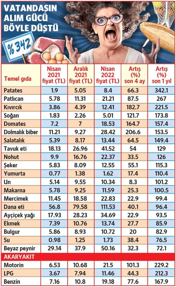 TÜİK verileri üzerinden yapılan hesaplamalara göre, halkı gıdadan yoksun bırakan acımasız zamların liste başında patates bulunuyor. TÜİK'in fiyat aldığı marketlerde 1 kilogram patatesin fiyatı geçen yılın nisan ayında 1 lira 90 kuruştu. Bu yılın nisan ayında da yine aynı marketlere giden TÜİK, 1 kilogram patatesin fiyatının 8 lira 40 kuruşa satıldığını tespit etti. Patates birçok markette çok daha yüksek fiyatlara satılmasına rağmen TÜİK'in marketlerinde bile bir yıllık artış oranı yüzde 342.1 olarak hesaplandı. TÜİK hesaplarıyla yıl başından bu yana patates fiyatlarına da yüzde 66.3 oranında zam geldi.